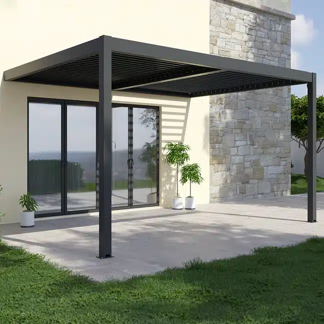 La pergola bioclimatique KEA se fixe à la façade et au sol, et possède des lames orientables parallèlement à la façade.